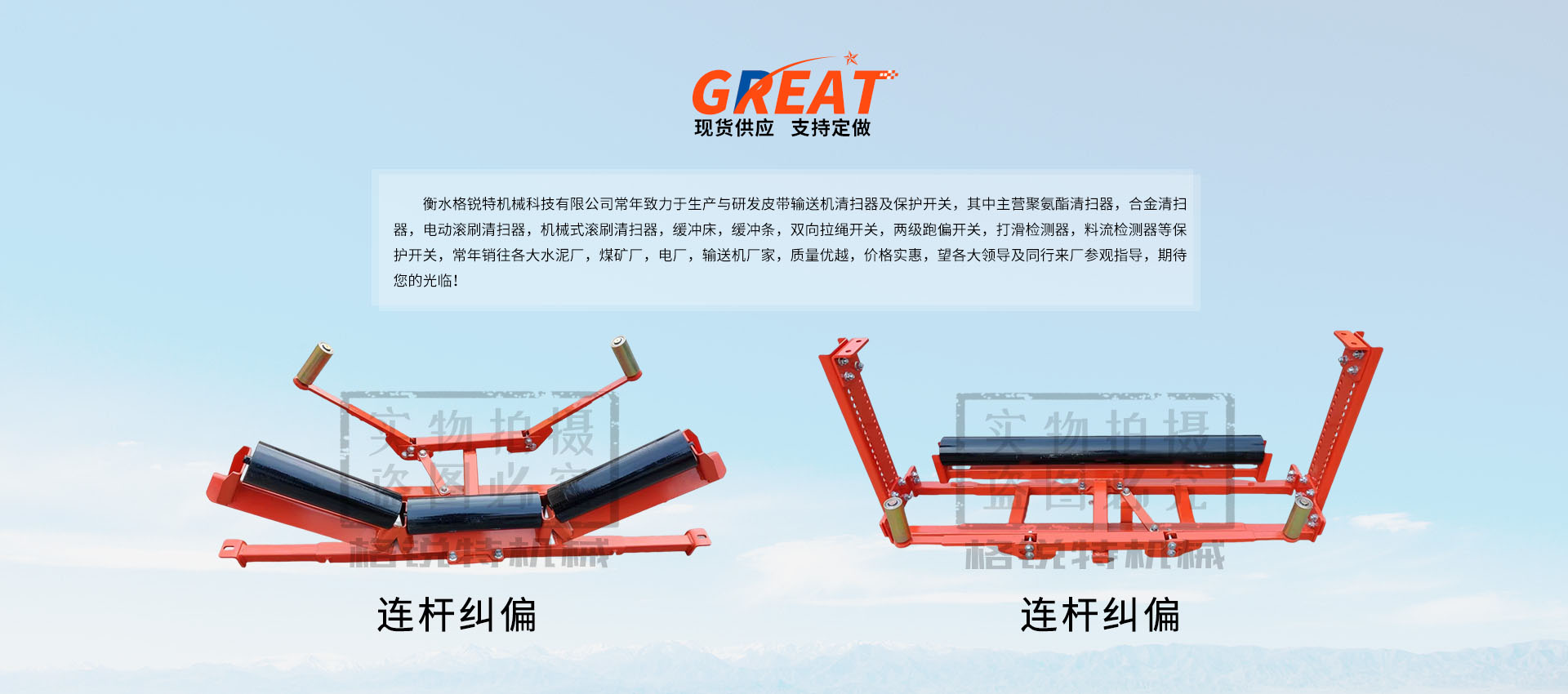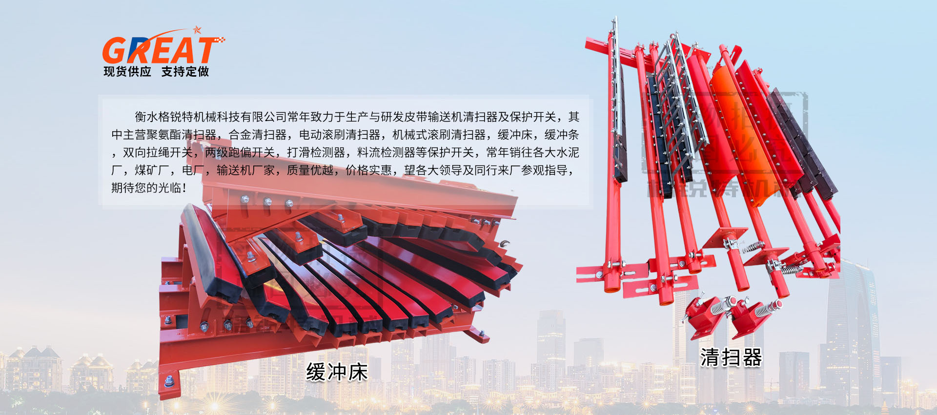 衡水格銳特機(jī)械科技有限公司常年致力于生產(chǎn)與研發(fā)皮帶輸送機(jī)清掃器及保護(hù)開關(guān),其中主營聚氨酯清掃器,合金清掃器,電動滾刷清掃器,機(jī)械式滾刷清掃器,緩沖床,緩沖條,雙向拉繩開關(guān),兩級跑偏開關(guān),打滑檢測器,料流檢測器等保護(hù)開關(guān),常年銷往各大水泥廠,煤礦廠,電廠,輸送機(jī)廠家,質(zhì)量優(yōu)越,價格實(shí)惠,望各大領(lǐng)導(dǎo)及同行來廠參觀指導(dǎo),期待您的光臨?。?!